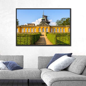 Celebrate the serene beauty of Potsdam with this canvas print showcasing a traditional windmill and a charming yellow building. The winding pathway surrounded by tall hedges and lush trees creates a peaceful atmosphere, making it a delightful addition to your home decor.