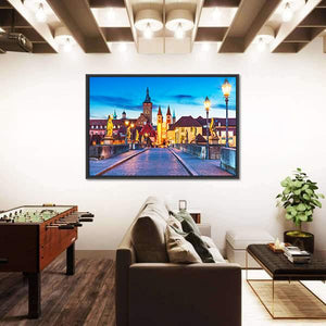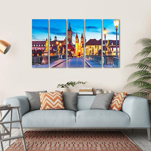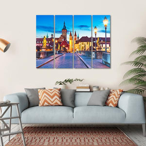 Capture the charm of Wurzburg with this canvas wall art featuring a historic bridge adorned with statues and street lamps. The peaceful, vibrant scene showcases a cobblestone street and intricate gothic architecture, creating a delightful atmosphere in any space.