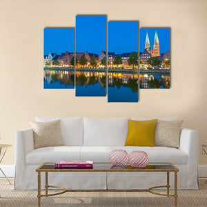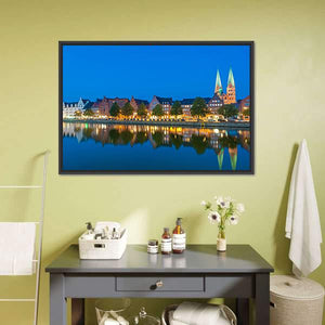 River Untertrave With Church Canvas Wall Art presents a calm, realistic cityscape of buildings and church spires reflected in the river, with lights softly shimmering on the water. The blue-and-orange palette and tranquil mood suit modern wall decor and contemporary rooms.