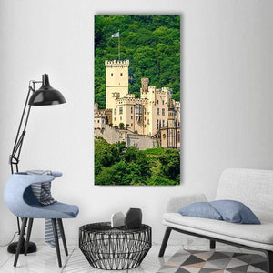 Stolzenfels Castle at Rhine Valley shows a realistic view of a historic castle beside fluffy green trees, with a tall tower on the left and a small flag. The muted greens, soft grays and warm yellows create a majestic, serene mood that works well with classic or modern room decor.