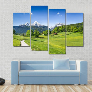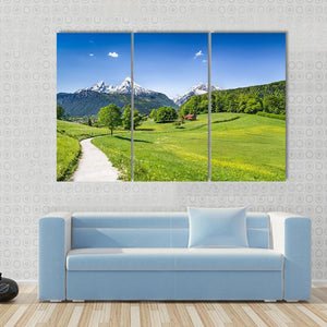 This canvas art captures a serene summer landscape in Bavaria, Germany, featuring majestic mountain peaks and lush green fields. The pathway invites you into the scene, framed by trees, creating a peaceful atmosphere perfect for any room.