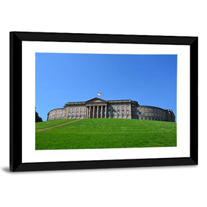 This canvas art captures the majestic Wilhelmshoehe Castle amidst lush green hills and a clear blue sky. The serene atmosphere and realistic depiction of classical architecture bring a grand touch to any space.