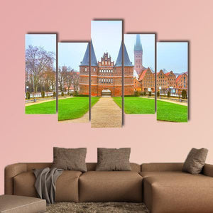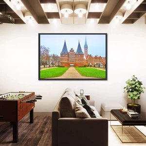 The Holstein Gate in Lubeck shows a symmetrical cityscape centered on an arched gateway flanked by twin pointed towers, with grass under an overcast sky. Rendered in brown, green, blue, and gray tones, the architectural image feels grand and serene. It suits living rooms, entryways, or offices with historic or architectural decor.