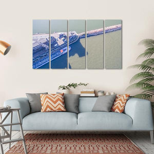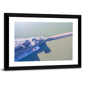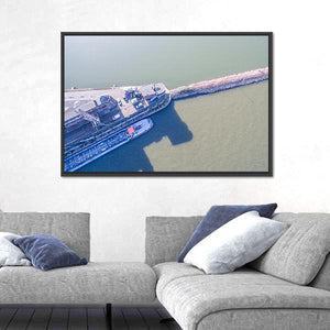 This canvas art captures the serene industrial scene of the Harbour of Krefeld, featuring two ships docked near a stone breakwater. The aerial perspective and strong diagonal lines create a vast landscape, accentuated by shades of blue, green, gray, and tan.