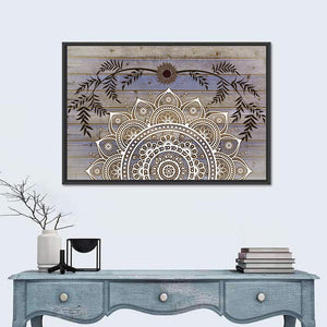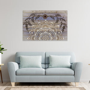 This mandala design features a calming palette of beige, brown, white, and blue, creating a peaceful atmosphere. The wood grain background enhances its rustic charm, while floral elements and a sunflower accent add a touch of nature, making it a perfect fit for a serene space.