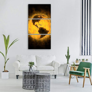 An abstract depiction of the Earth centered in the frame, surrounded by a fiery glow of yellow, orange, black, and brown. The image carries an intense, dramatic, and fiery mood and works well as bold wall decor in modern, abstract interiors.