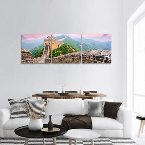 This panoramic canvas shows the Great Wall of China winding over a mountain range with a watchtower beneath wispy clouds. Rendered in a photorealistic style with greens, browns, soft pinks and blues, it gives a serene, majestic mood and works well in living rooms or modern offices.