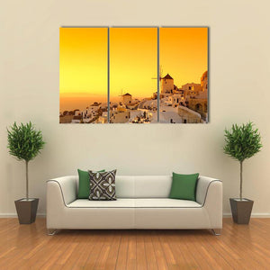 Capture the serene beauty of a Greek island at sunset with this canvas wall art featuring a charming village with traditional windmills. The warm palette of yellow and orange tones evokes a romantic atmosphere, making it a lovely addition to any space.