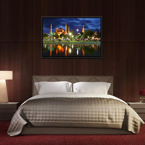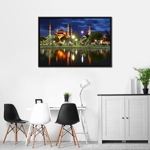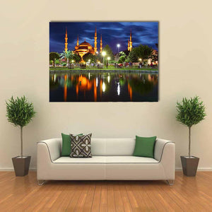 This canvas art captures the serene beauty of the Blue Mosque in Istanbul at night, reflecting its majestic domes and minarets in calm waters. The vibrant palette of blues and oranges creates a tranquil atmosphere, perfect for enhancing any space.