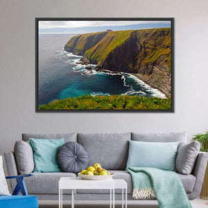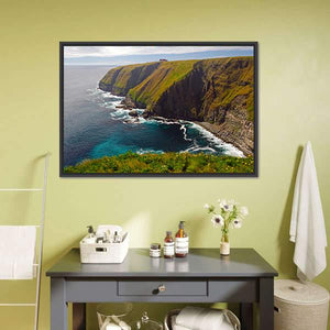 This canvas art showcases the breathtaking coastal cliffs of Cape St Mary, surrounded by lush grass and vibrant wildflowers. The serene yet dramatic scene captures crashing waves against a small building perched on the edge, creating a natural harmony that enhances any wall decor.