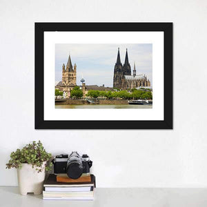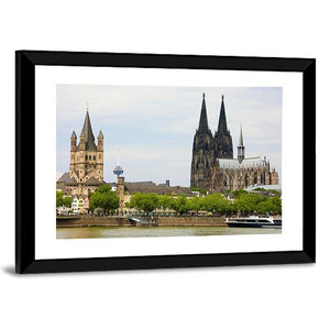 This canvas art features the majestic Cologne Cathedral, set against a serene background that includes a gentle river and trees. Its realistic depiction captures the grand architecture and historic ambiance, making it a stunning addition to your wall decor.