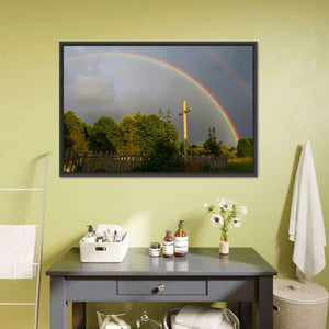 The Cross & Rainbow Canvas Wall Art depicts a serene landscape, featuring a double rainbow arching over a wooden cross and fence, surrounded by lush trees. This artwork evokes a sense of hope and spirituality, perfect for brightening any space.