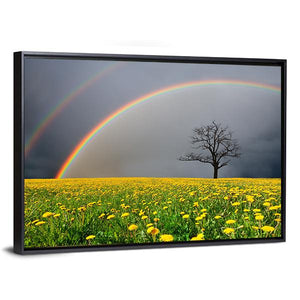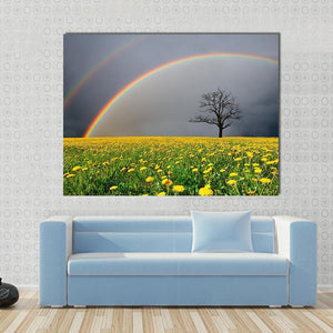 This canvas art depicts a vibrant field of yellow flowers under a stormy sky, highlighted by a double rainbow and a bare tree. Its serene and hopeful atmosphere is perfect for adding a touch of nature to your space.