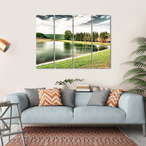 This serene landscape features a tranquil pond surrounded by trees and green hills under a sky dotted with clouds. The calm atmosphere is enhanced by the gentle reflections in the water, making it a perfect addition to your nature-inspired décor.