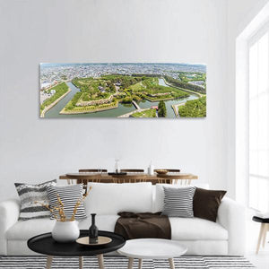 Aerial panoramic view of Goryokaku Park in Japan, showing the star-shaped fortress, tree-lined waterways, bridges and a city skyline in the distance. The realistic, peaceful composition uses greens, blues, greys and white to convey a sprawling daytime scene. Suits modern room decor and works well on living room or office walls.