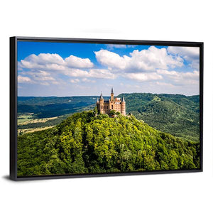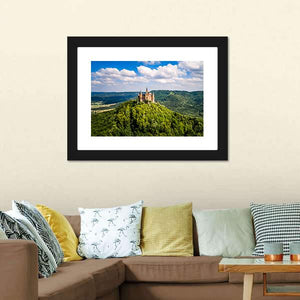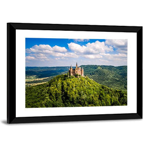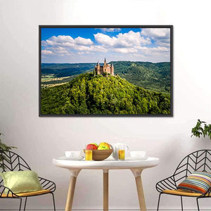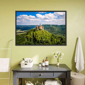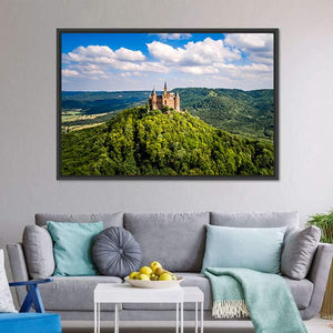 Hohenzollern Castle, Germany is shown as a centered castle on a hill framed by lush green forest beneath a blue sky with white clouds. The scene reads as majestic, serene, and picturesque. It provides a calm focal point for home walls and complements modern room decor.