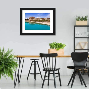 This canvas art captures the serene beauty of La Seu Cathedral, framed by palm trees and a picturesque waterfront. The bright palette of blues, greens, and tans evokes a calm atmosphere, making it a charming addition to your wall decor.