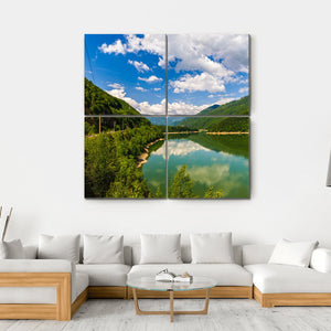 Bring the serene beauty of the Olt River into your space with this captivating canvas art. Featuring a wide-angle perspective that showcases lush green mountains, a tranquil lake, and bright blue skies reflecting in the water, it effortlessly adds a natural touch to any decor.