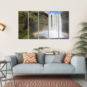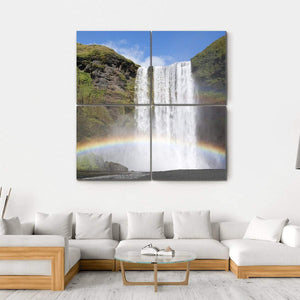 This canvas artwork captures the majestic Skogafoss waterfall in Iceland, adorned by a vibrant rainbow. Lush green cliffs and rocky formations create a natural and awe-inspiring scene that brings the beauty of nature to your space.