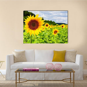 This photographic canvas shows a close-up sunflower in the foreground with a field of sunflowers stretching into the distance under a partially cloudy sky. Using a rule-of-thirds composition, the image brings a bright, vibrant, natural summer mood in yellow, green, blue, and brown tones. Suited to modern house and room decor.