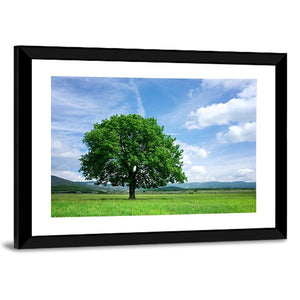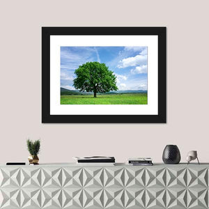 A single large tree stands in a wide green field under a blue sky with wispy clouds and distant mountains. Composed with a rule-of-thirds layout, the scene feels peaceful and serene and works well in home living rooms or bedrooms with modern nature decor.