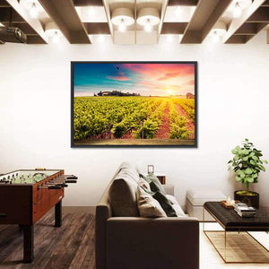 Experience the serene beauty of Tuscan vineyards at sunset with this captivating canvas wall art. The vibrant palette of greens, blues, and warm oranges captures rows of grapevines under a painted sky, framed by a distinguished farmhouse and a flying bird. This artwork is perfect for adding a touch of rustic charm to any space.