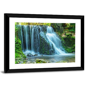 This canvas wall art depicts a serene waterfall cascading over moss-covered rocks, surrounded by a lush natural landscape. The tranquil palette of greens, blues, and grays creates a refreshing atmosphere, making it a perfect piece for nature lovers.