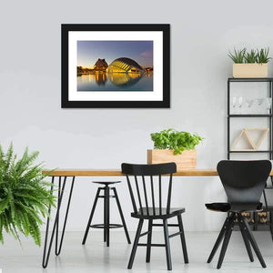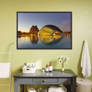 Experience the serene beauty of modern architecture with our Cinema In Valencia panoramic canvas wall art. This vibrant piece features stunning waterfront reflections and a striking glass dome building, perfect for adding a touch of contemporary charm to your space.