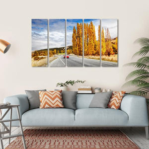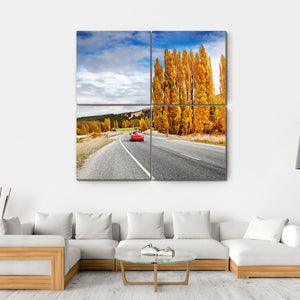 Capture the serene beauty of a winding road in New Zealand, lined with tall golden trees. This peaceful landscape features a vibrant mix of autumn colors, enhanced by a striking red car, creating a dynamic and realistic scene.