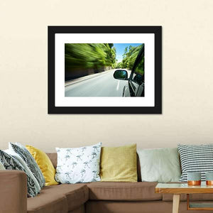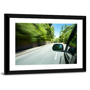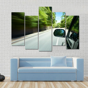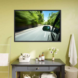This vibrant canvas features a dynamic scene of a car speeding down a road, surrounded by lush trees. The bright colors and abstract style create a sense of movement, making it an engaging addition to any modern decor.
