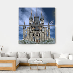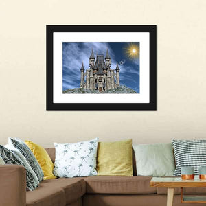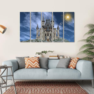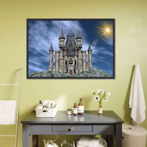 This enchanting canvas art features a fairytale castle perched atop a rocky hill, surrounded by serene mountains and fluffy clouds. The whimsical scene, highlighted by a bright sun and playful bubbles, creates a magical atmosphere that brightens any space.
