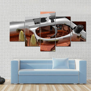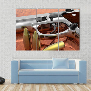 This powerful canvas art features a chrome-finished pistol and golden bullets set against a rich wood grain background. The serious and detailed composition highlights a close-up, angled view that brings a modern, metallic feel to any space.