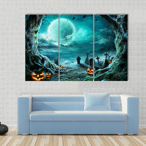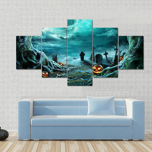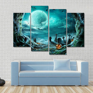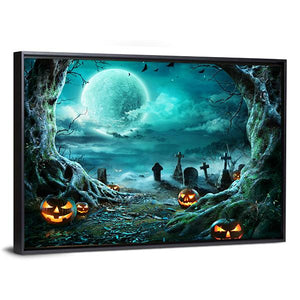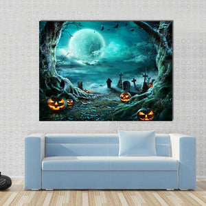 This canvas art piece captures a haunting graveyard scene illuminated by glowing jack-o'-lanterns under a full moon. With its eerie atmosphere and dark palette of greens, blacks, and oranges, it adds a mystical touch to your Halloween décor.