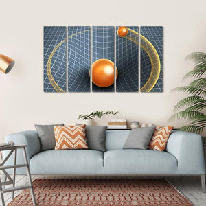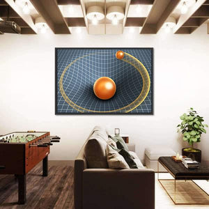 This abstract canvas art features a gravity well with orbs set against a dynamic grid. Its captivating palette of blue, orange, white, and gold creates a scientific and surreal atmosphere, making it a striking addition to any modern decor.