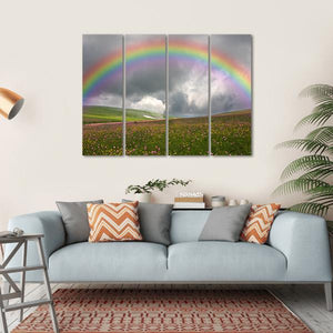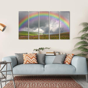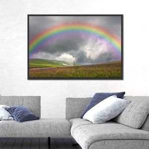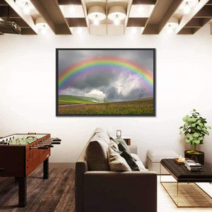 This captivating landscape showcases a rainbow arcing across a stormy sky, with a field of vibrant pink and yellow flowers in the foreground. The contrast of colors creates a dramatic yet serene atmosphere, perfect for adding a hopeful touch to your space.