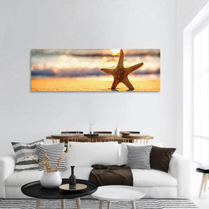 A photorealistic panoramic print showing a starfish standing upright on a sunrise beach. Sunlight reflects on shallow water and wet sand, creating a peaceful, warm mood that works well in coastal or modern room decor.