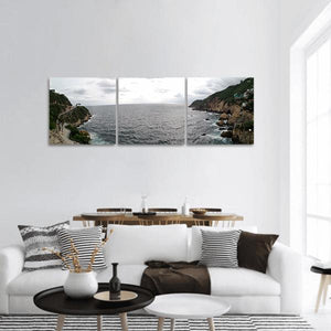 A panoramic photographic landscape of the Acapulco Gulf Coast featuring rocky cliffs, calm blue-gray water and an overcast sky that creates a serene, vast, natural mood. The realistic coastal scene works well in modern or coastal rooms, adding a quiet, contemplative presence to your wall decor.
