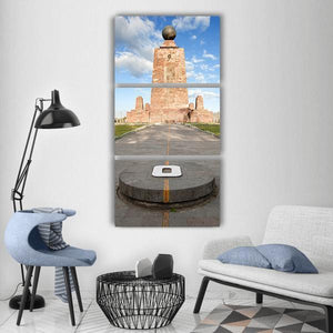 A realistic canvas print of the pyramidal monument on the equator in Ecuador, named for its central subject and clear, bright mood. The low-angle, vanishing-point composition highlights the stone monument topped by a sphere, the paved walkway with its yellow line, and ruined structures at the sides. Works well in modern living rooms or entryways that favor architectural landscapes.