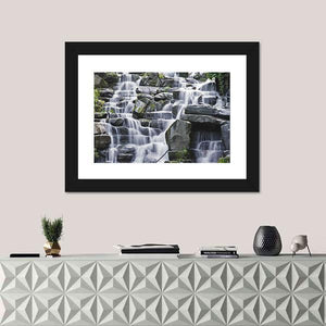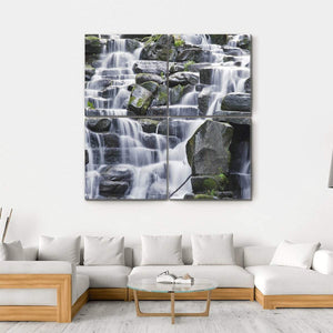 Experience the tranquil beauty of a waterfall cascading over smooth, flat rocks in this stunning canvas wall art. The serene scene, adorned with lush moss and vibrant foliage, creates a natural atmosphere perfect for any space. This realistic portrayal captures the movement of water with its long exposure effect, bringing a peaceful vibe to your decor.