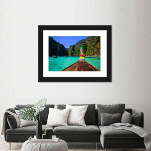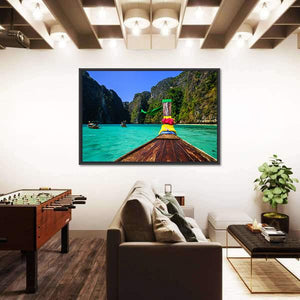 This beautiful canvas art piece captures the graceful bow of a longtail boat set against the vibrant colors of tropical water and cliffs. The realistic portrayal evokes a sense of travel and adventure, making it a charming addition to your wall decor.