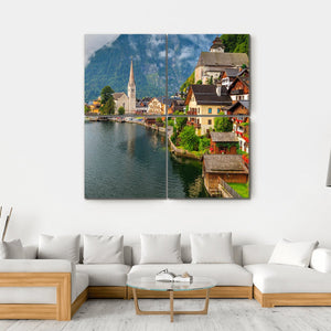 This charming canvas print captures the picturesque town of Hallstatt, nestled between serene waters and majestic mountains. The tranquil scene includes a stunning church steeple and hillside homes, evoking a rustic and traditional ambiance perfect for any cozy space.