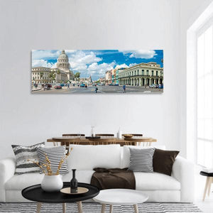 This panoramic canvas captures El Capitolio in Havana, a sunlit cityscape with its domed building, arcades, cobblestone street, vintage cars and palm trees under a bright blue sky. Rendered in a photorealistic, documentary style with a blue, white and beige palette, it adds vibrant, historical energy to a modern living room, hallway, or office.
