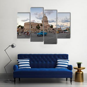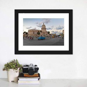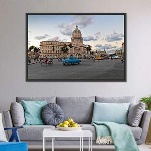 Capture the vibrant life of Havana with this canvas art featuring the iconic Capitol building, a classic blue car, and lively street scenes. The warm palette of blues and tans adds a historic charm to your wall decor.