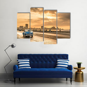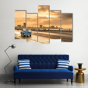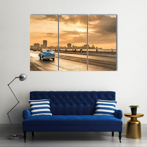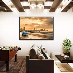 This captivating artwork features a vintage blue car cruising along Ocean Drive as the sun sets over Havana's skyline. The warm oranges and cool blues create a nostalgic and serene atmosphere, perfect for adding a touch of vintage charm to your space.