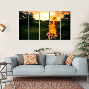 Capture the essence of a warm summer evening with our Bonfire At Camp canvas wall art. This serene landscape features a peaceful bonfire surrounded by lush greenery, with a stunning sunset painting the sky in shades of orange and yellow. It's a perfect addition for lovers of nature and rustic décor.