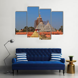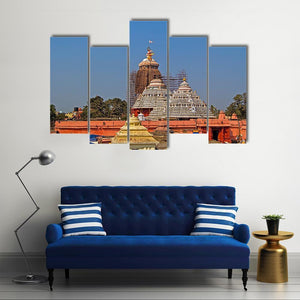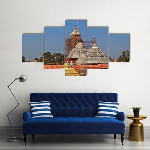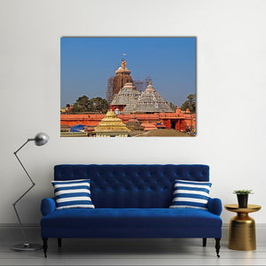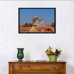 This artwork captures the majestic Krishna Jagannath Temple under a clear blue sky. The detailed depiction of religious architecture with its ornate spires and layered roofs evokes a serene and historical ambiance.