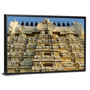 Experience the grandeur of the Ekambareswarar Temple with this striking canvas wall art. Featuring intricate carvings and an ornate facade against a clear blue sky, it's a beautiful representation of traditional temple architecture.