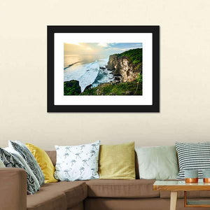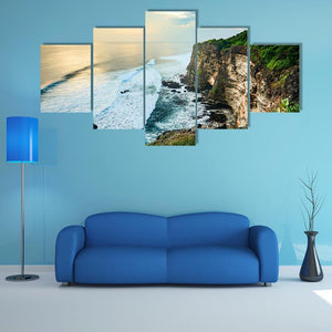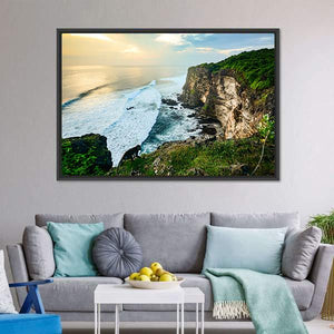 This canvas features a breathtaking view of coastal cliffs and ocean waves, capturing the serene and powerful mood of nature. The photorealistic style showcases white foam crashing against the rocky shore, set against a palette of blue, green, and tan.