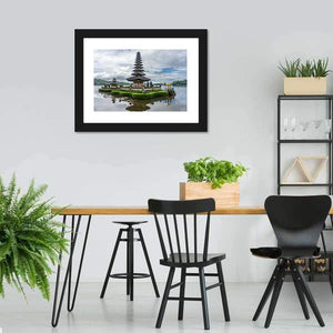 A realistic depiction of a Hindu temple in Indonesia set beside calm water and lush gardens. Its symmetrical composition and palette of green, brown, blue, and white creates a serene, tranquil, and majestic mood that suits living rooms, bedrooms, or hallways.
