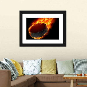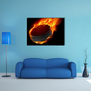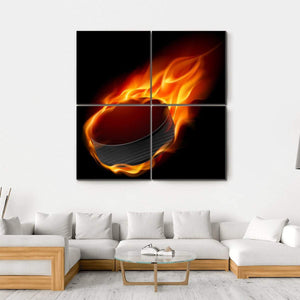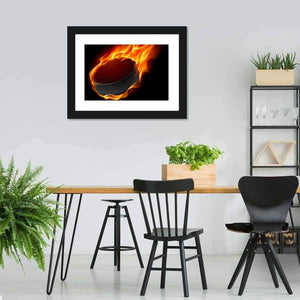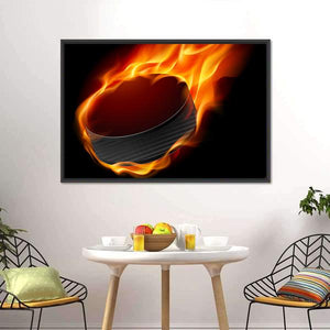 This dynamic artwork features a close-up of a hockey puck engulfed in flames, creating an intense and energetic atmosphere. With its vibrant palette of red, orange, and black, it adds a striking focal point to any space, perfect for sports enthusiasts and modern decor.